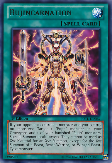 If your opponent controls a monster and you control no monster: Target 1 "Bujin" monster in your Graveyard and 1 of your banished "Bujin" monsters; Special Summon both targets. They cannot be used as Xyz Material for an Xyz Summon, except for the Xyz Summon of a Beast, Beast-Warrior, or Winged Beast-Type monster.