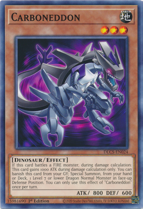 If this card battles a FIRE monster, during damage calculation: This card gains 1000 ATK during damage calculation only. You can banish this card from your GY; Special Summon, from your hand or Deck, 1 Level 7 or lower Dragon Normal Monster in face-up Defense Position. You can only use this effect of "Carboneddon" once per turn.